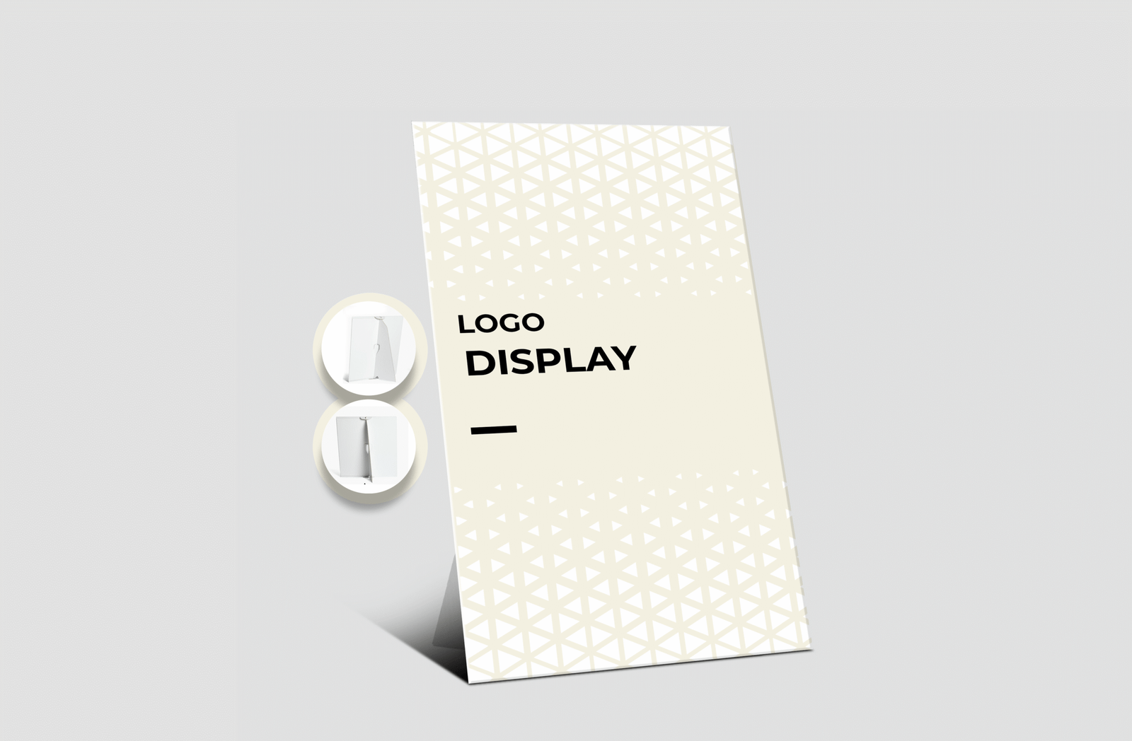 Ofrecemos un único modelo de display: sobremesa A4, impreso en cartulina de 400 g con peana trasera. No hay otras opciones de tamaños, materiales ni acabados.
